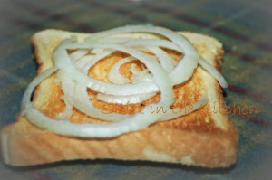 On toast, lay thinly sliced onion rings,