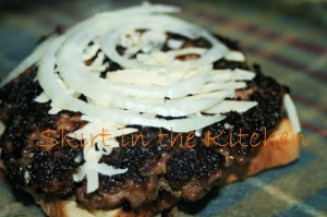 Lay the seared patty, then a repeat of onion and Parmesan over patty.