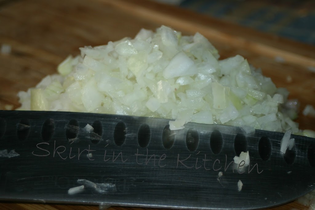 Finely chop 1 yellow onion and sauté in 2 tablespoons olive oil.