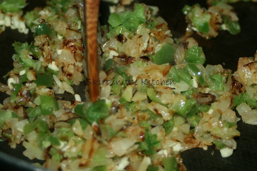 Add to the skillet half of a chopped green bell pepper. Drain and rinse 3.75 ounces black beans; drain again, well, then soak remaining liquid in paper towels.
