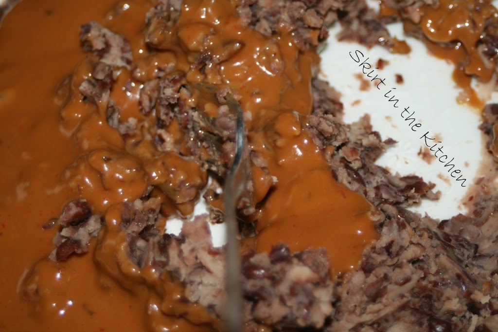 Into mashed black beans, mash to work in 1/3 cup Thai Peanut Satay Sauce.