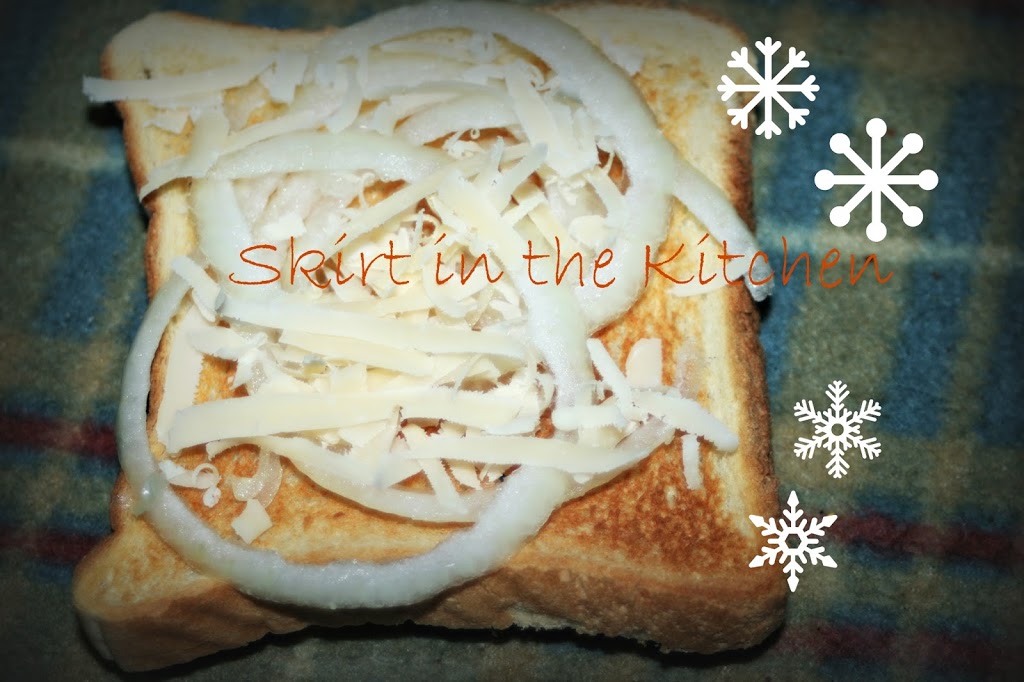 On toast, lay thinly sliced onion rings,