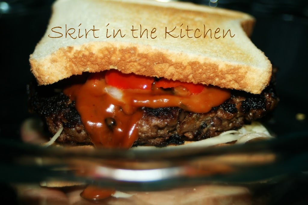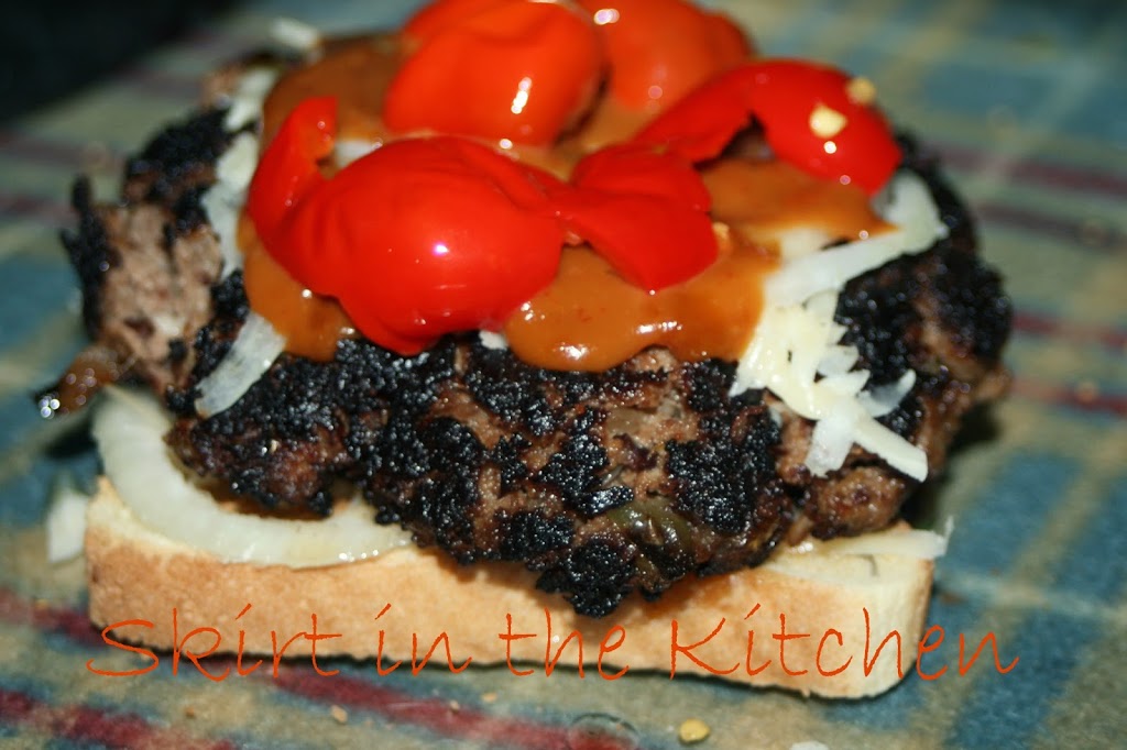 Warm sauce in a small pan, drizzle over patty, the top with jarred/canned cherry peppers.