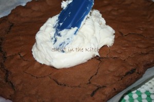 When crust has been completely cooled, spread frosting onto brownie; leave a ridge like you would for a typical pizza.