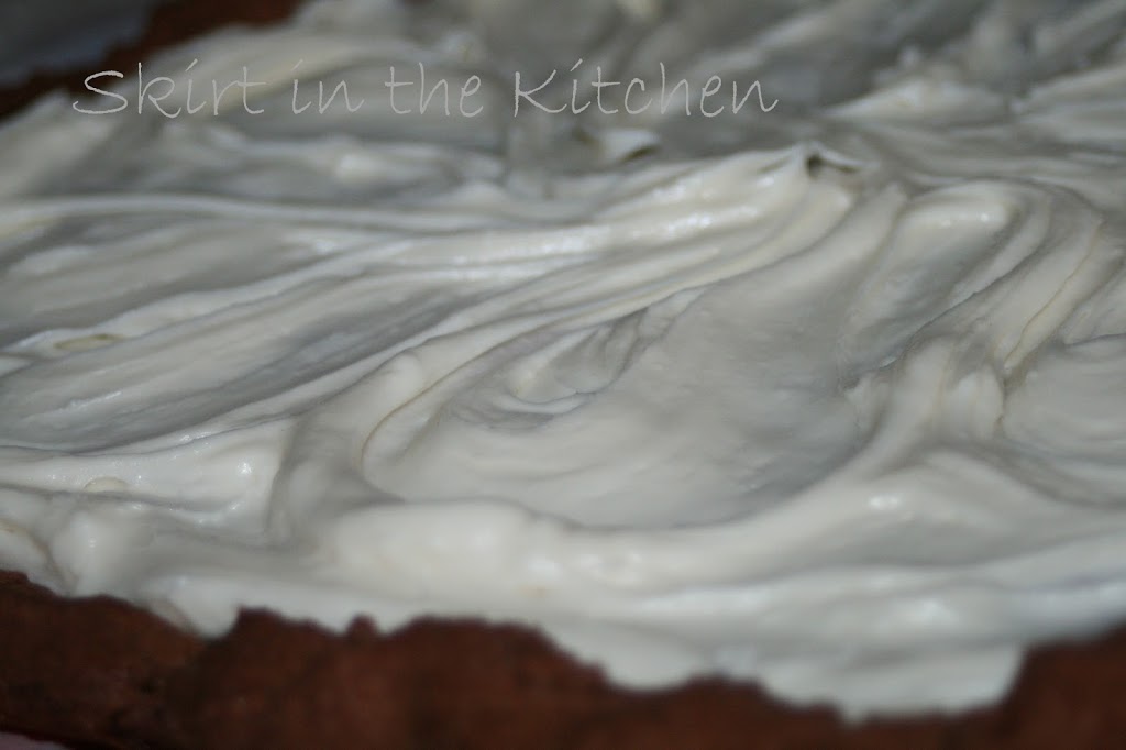 Over cream cheese frosting, add quartered strawberries,