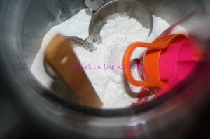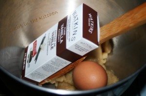 Beat with the spoon 1 large egg and 1/2 teaspoon vanilla extract into dough batter.