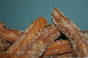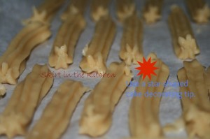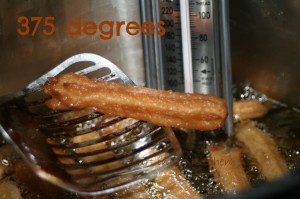 Preheat oven to 300 degrees Fahrenheit. Fill a decorating bag with the dough, using a large star. Pipe 4×1-inch sticks onto waxed paper. Gradually and slowly heat 3 inches vegetable oil in a heavy pot that reaches 375 degrees F.