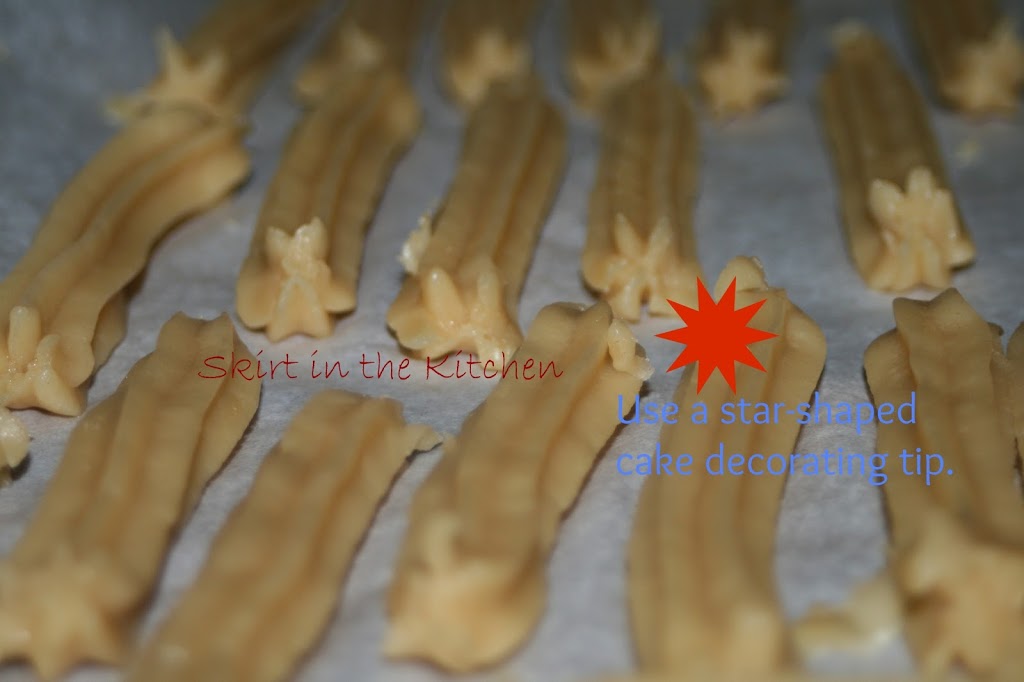 Preheat oven to 300 degrees Fahrenheit. Fill a decorating bag with the dough, using a large star. Pipe 4×1-inch sticks onto waxed paper. Gradually and slowly heat 3 inches vegetable oil in a heavy pot that reaches 375 degrees F.