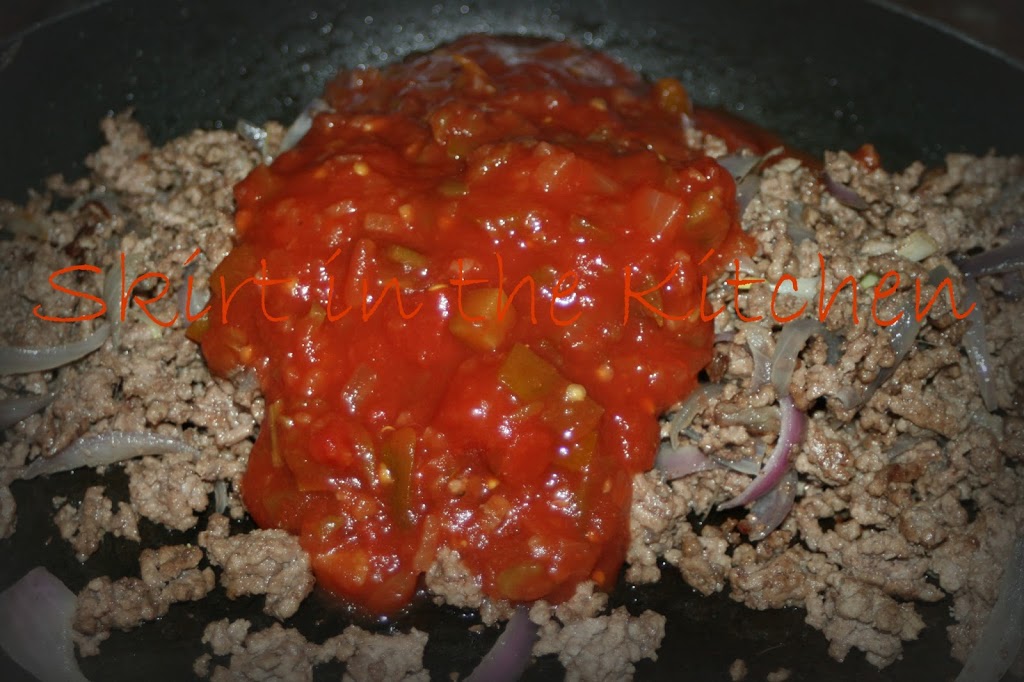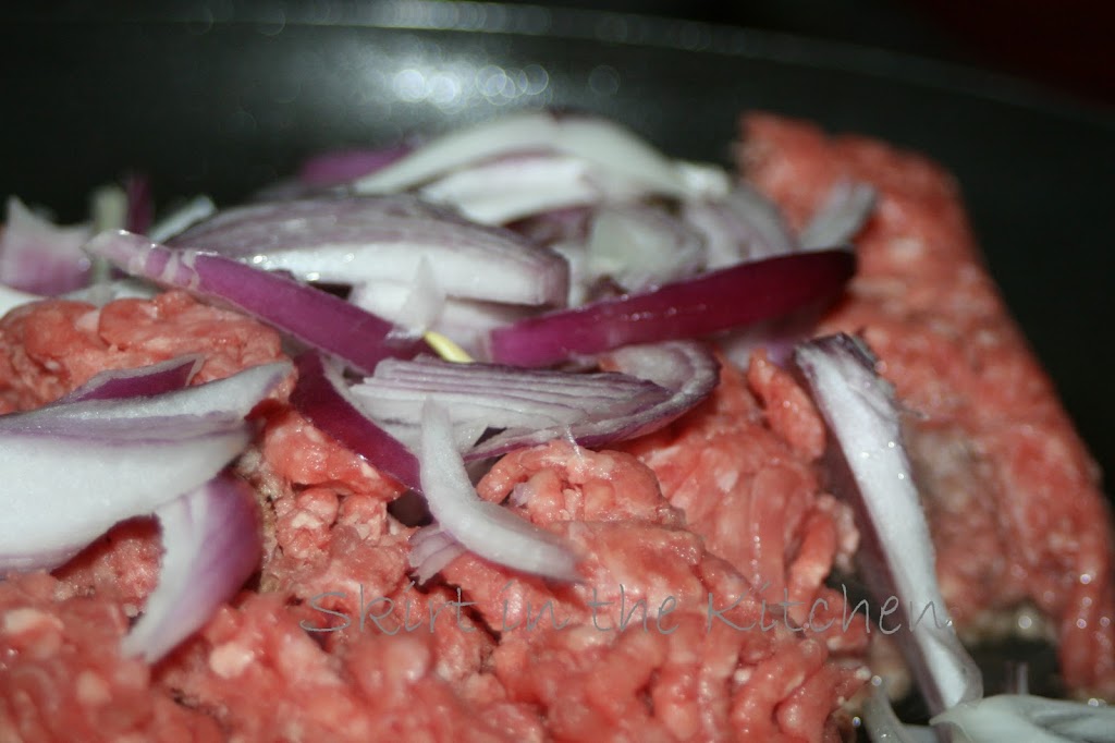 Brown 1 pound lean ground beef along with 1 small red onion cut in thin wedges. Drain off any fat.