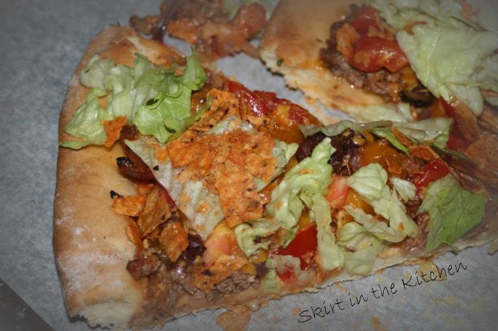 As soon as crust is out of the oven, spread the meat and salsa mixture. Bake for 5 minutes. Add 1 1/2 cups coarsely chopped tomatoes, 1/3 cup pitted kalamata olives, and 1 1/2 cups shredded cheddar; bake again for 10 minutes.