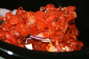 Salt and pepper all sides of a rump roast– fat-side up, lay in the bottom of a crock pot with 1 inch beef broth. Over the top of the roast, douse with red wine vinegar and ketchup. Add sliced red onion, 2 tablespoons chunked butter, chilies in Adobo sauce including a small amount of the sauce, 2 cloves finely chopped garlic, and 1 can drained fire-roasted tomatoes. Cover and slow-cook on high until meat is fork-tender, falling apart.