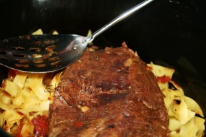 When meat has been cooked tender, lift from the pot, transfer to a plate and place egg noodles in the bottom of the crock pot– (Cook just enough egg noodles, having no leftovers since egg noodles have a tendency to break down the longer they set but they are good in this dish. You may wish to opt for a different type of noodle)… Put the meat back in the pot on top of the noodles; pour remaining beef broth over the noodles along the sides of the meat, just covering them– not the meat. Put the lid back on and cook the noodles just enough to where they are not mushy, having the right texture. Then tear the meat with a fork, toss together, turning it into a one-pot dish.