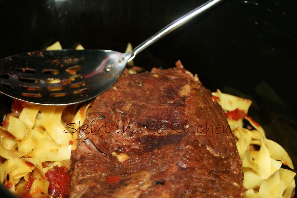 When meat has been cooked tender, lift from the pot, transfer to a plate and place egg noodles in the bottom of the crock pot– (Cook just enough egg noodles, having no leftovers since egg noodles have a tendency to break down the longer they set but they are good in this dish. You may wish to opt for a different type of noodle)… Put the meat back in the pot on top of the noodles; pour remaining beef broth over the noodles along the sides of the meat, just covering them– not the meat. Put the lid back on and cook the noodles just enough to where they are not mushy, having the right texture. Then tear the meat with a fork, toss together, turning it into a one-pot dish.