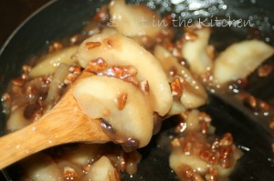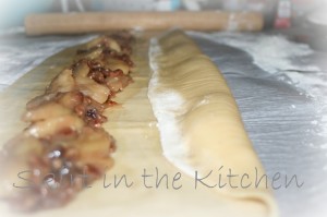 Make the filling:  Toast 1/2 cup pecan pieces in a skillet, stirring and tossing often.  Be careful not to brown too much, to not burn.  Add 2 tablespoons unsalted butter, 1 can apple pie filling, 1 tablespoon packed dark brown sugar, 1/4 teaspoon ground cinnamon, and 1/8 teaspoon coarse salt.  Stir to a melted stage, the butter; the heat soaking the sugar into the apples with the cinnamon.  Take off the heat and stir in the drained raisins.  Let cool, then cover and refrigerate.
