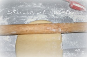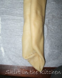Softly roll into a rectangle– 10×28 inches.  It is important that it be an exact size to fit both fillings and seal with the least amount of leakage as possible.