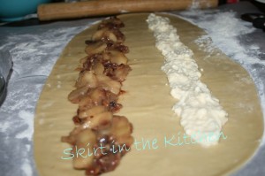 Being careful not to cut through the dough, score lightly down the center (lengthwise).  Fill on side with the apple filling; the other side with cream cheese filling.  Have a 1 1/2-inch allowance on all sides.  Brush with egg wash of the half-egg that was left over previously, whisked with 2 tablespoons milk.  Brush egg wash on all the edges.