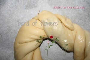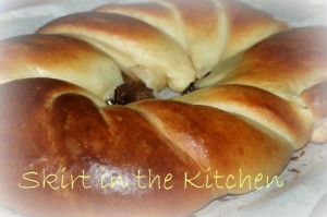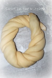 Secure the ends with toothpicks, pinning the ends into the wreath.   Brush egg wash all over it, cover it loosely and let rise for 1 hour in a warm place…  Then place the dough on a parchment-lined baking sheet and brush again with egg wash.  Bake at 375 degrees Fahrenheit for 25 to 30 minutes.  This is easy to burn, so cover the top with parchment during the last 5 minutes.  Cool on a rack, out of the pan, still on parchment paper.  But cool completely before frosting.