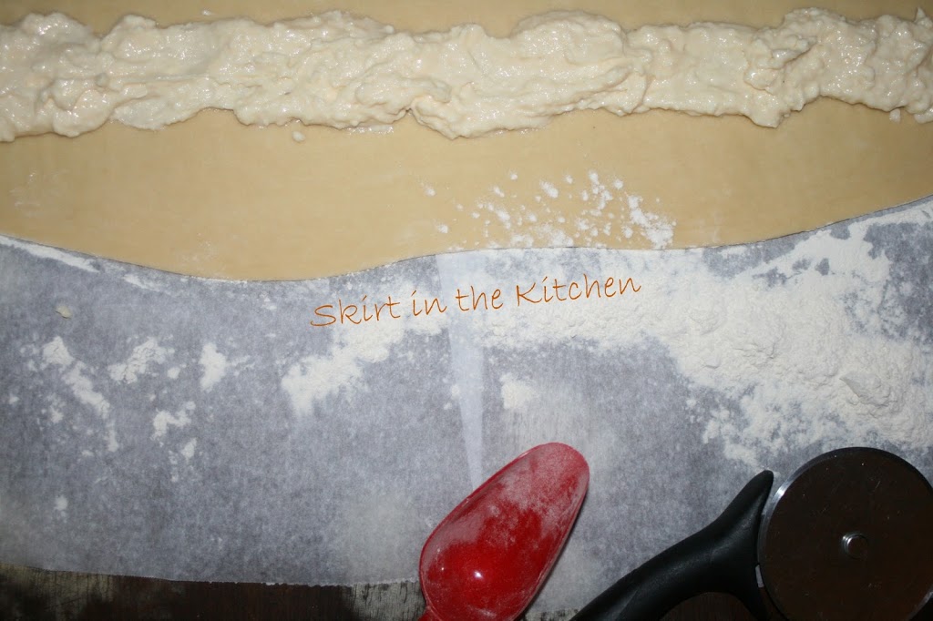 Have cream cheese filling made ahead of time:  Beat 8 ounces cream cheese, 1/4 teaspoon salt, 5 tablespoons sugar, and 3/4 teaspoons vanilla extract.  Whisk heavily or beat in a separate bowl 1 whole egg, but add to the cream cheese mixture just one-half of the frothy egg whisked or beat.  Reserve remaining egg half for egg wash.