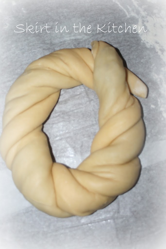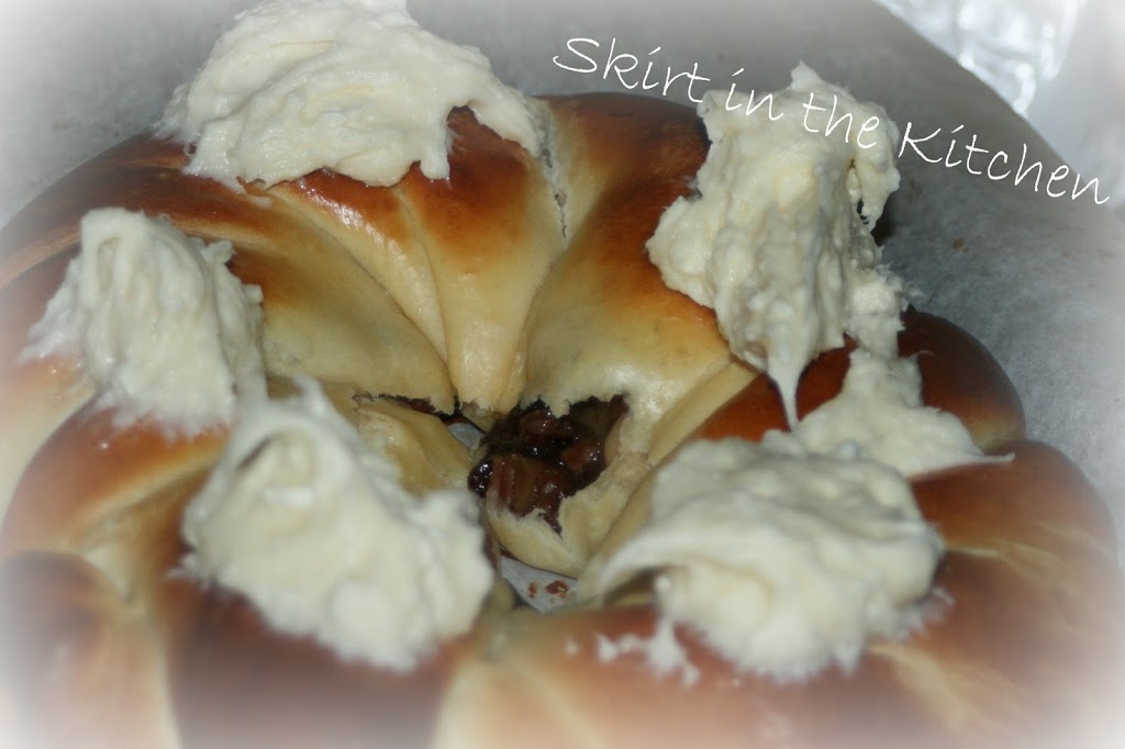 Secure the ends with toothpicks, pinning the ends into the wreath.   Brush egg wash all over it, cover it loosely and let rise for 1 hour in a warm place…  Then place the dough on a parchment-lined baking sheet and brush again with egg wash.  Bake at 375 degrees Fahrenheit for 25 to 30 minutes.  This is easy to burn, so cover the top with parchment during the last 5 minutes.  Cool on a rack, out of the pan, still on parchment paper.  But cool completely before frosting.