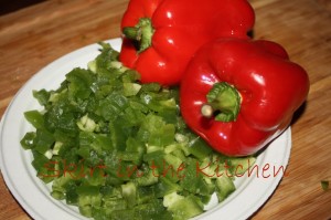 Chop bell peppers– 2 red, 2 green. Do the same for 2 medium or 1 very large yellow onion; plus 2 celery stalks. Set aside for later addition, but get ingredients prepared beforehand.