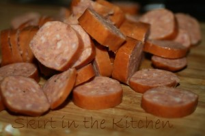 Slice 1 pound andouille sausage; bring all ingredients to a boil. Lastly, stir in the chicken and hot sauce to taste. Serve with white rice.