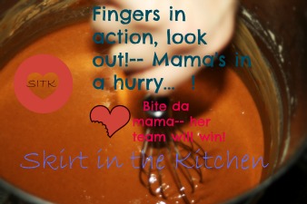 Stir for a mighty long time, 45 minutes to 1 hour-and-5 minutes without stopping. May the the one with the longevity get the score, babe! “BITE MY BUTT!” (Close your ears, Mom, it’s really not the way it sounds… just gettin’ it done!) Man power in these feminine arms of mine, lol… (I just know my husband will be displeased when his team sucks, as usual, lol, argh argh – ugh, ugh… but mine WINS! Am I just a blast when I’m a kill-joy… lol, again, please– group hug.)