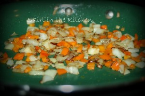 Drizzle more mushroom oil in the bottom of the skillet, heat to softly brown chopped carrots, onion, shallots, and sliced garlic.  Salt and pepper with coarse white pepper; it’s got a different, mild flavor.