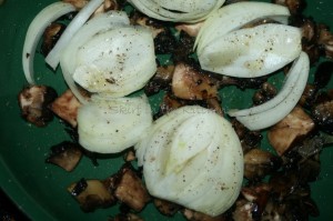 Remove from the pan and cook mushrooms; lay chunks of onion with drizzled mushroom oil (salt and pepper again, but with black pepper this time) over cooked mushrooms,