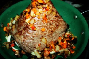 then the roast– top with cooked vegetables; cover with double-layered foil and roast it for a few hours until juicy and tender.