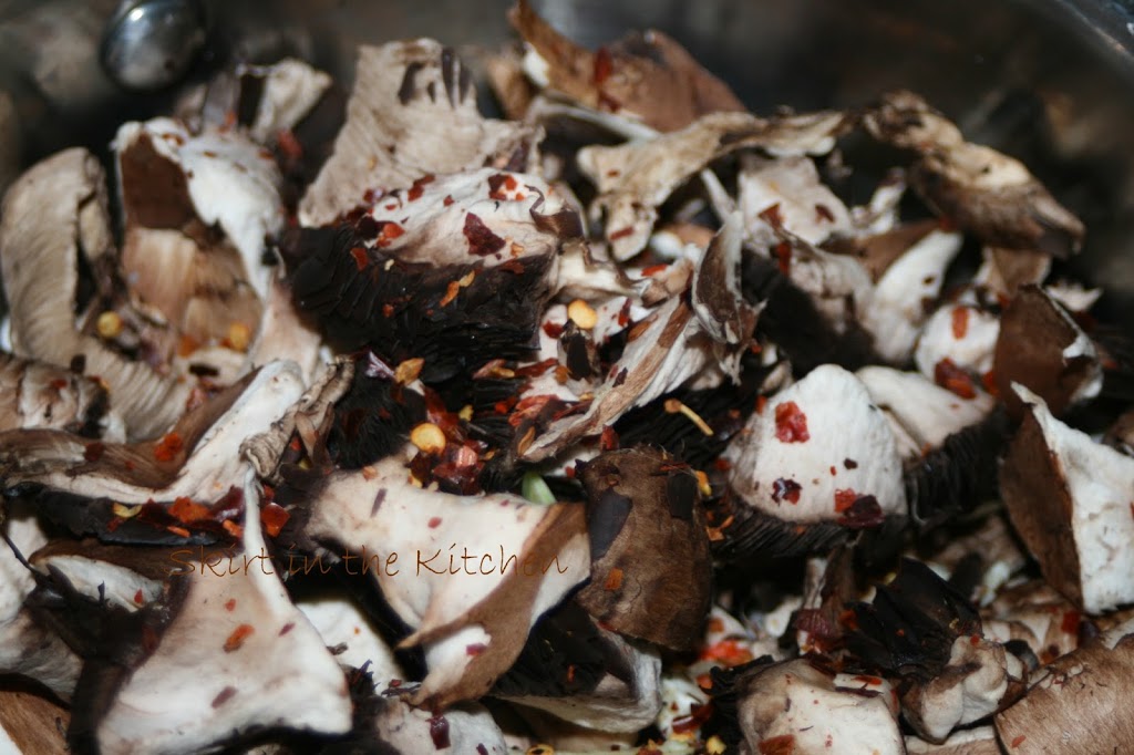 Heat in olive oil (1 34- fluid ounce glass bottle), in a medium saucepan, chopped mushrooms, red pepper flakes, and minced or finely chopped garlic.  When cooled, Stuff the mushrooms and funnel the seasoned oil back into the jar.  Wait several days before the first use.  (Keep oil refrigerated after infused with mushrooms.)