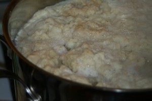 In a large pot, heat water with light salt; bring to a boil. With wet hands, form 1 1/2-inch balls and drop into the boiling water. Cover and simmer for 30 minutes. In a medium pot, bring 8 cups chicken broth to boil near the latter part of cooking the matzo balls.