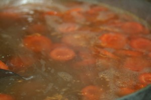 Slice 4 carrots, cut on the diagonal, and drop into the broth during the last 7 minutes of the matzo balls being ready for soup.