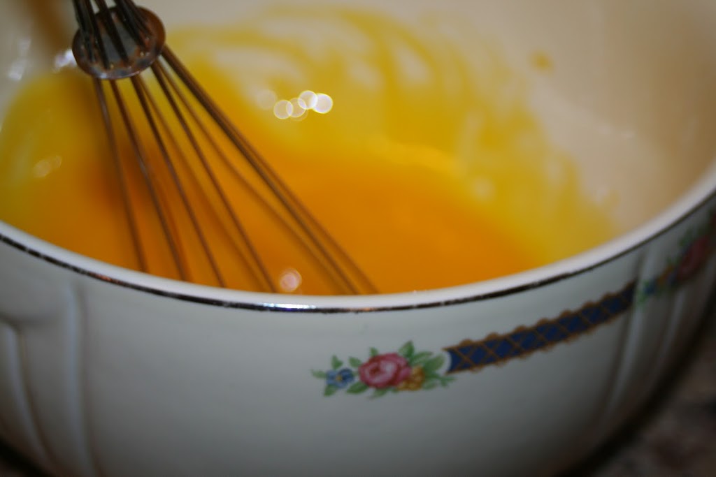 Whisk together the warmed fat (1/4 cup), 1/4 cup broth, 4 large egg yolks, salt and pepper.