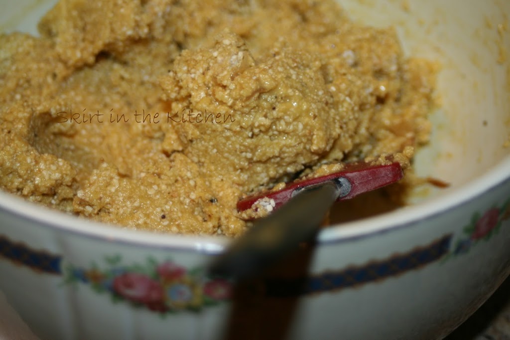Mix a third of the beat egg whites into the matzo meal mixture,