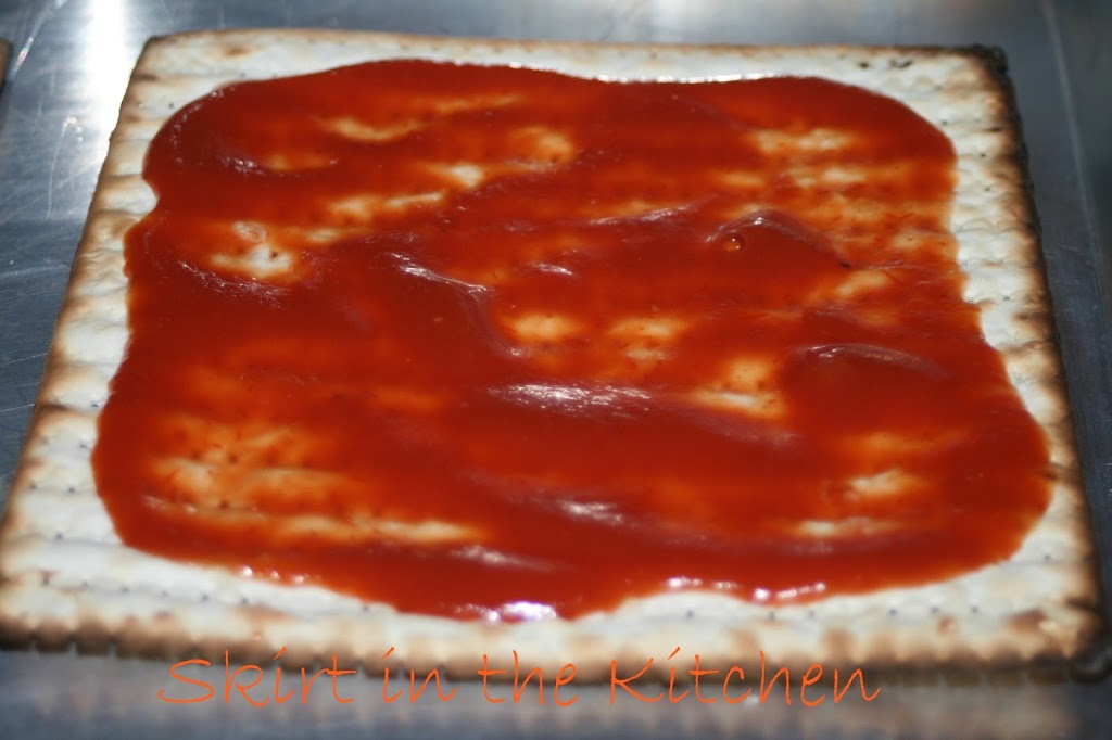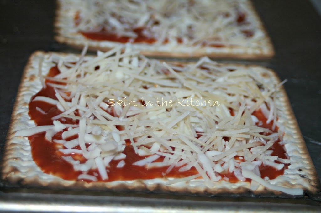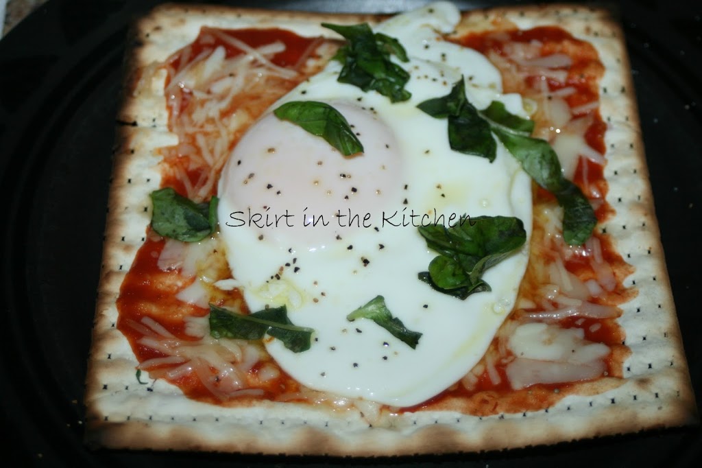 Matzo PizzaMarch 28, 2013 By Susan Nuyt Leave a CommentSouthern Skirt Edition ~ “Skirtin’ Around the South”~ adapted from Martha Stewart ~Spread tomato sauce over matzo.Scatter mozzarella and Parmesan. Bake until melted, warmed in the oven at 400 degrees.Top with egg and fresh basil.