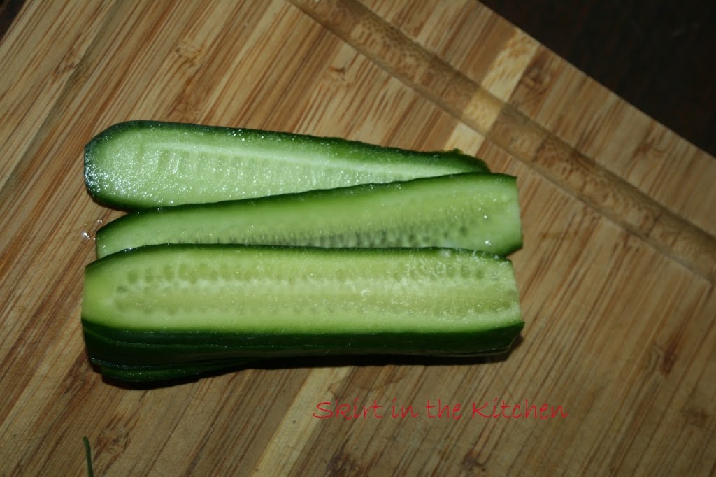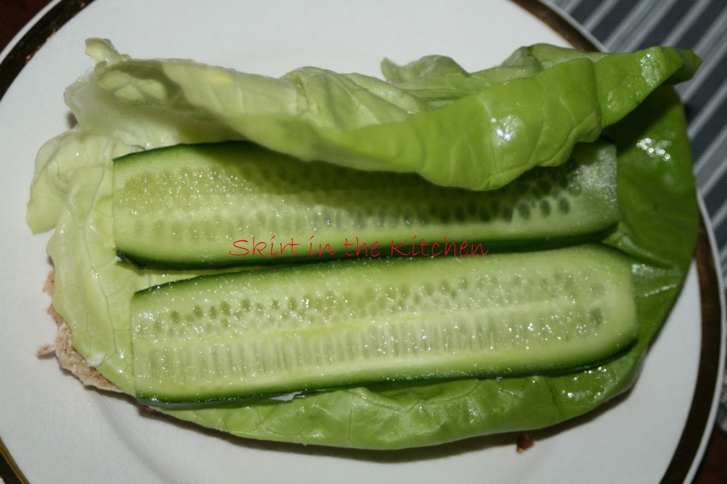 Make a lettuce cucumber sandwich with buttered slices of bread.