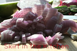 Chop 1/2 of a green apple, 1 seeded jalapeno, and 1/2 of a red onion.