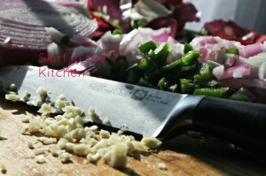 Sauté in olive oil until very dark but add the green apple halfway though cooking. Add more oil if needed and sauté the remainder of the onion, the rest of the apple, 2 added and chopped mini sweet peppers, and 2 cloves chopped garlic but do not brown this batch that is added, just cook until tender along with the first batch still in the skillet left cooking.