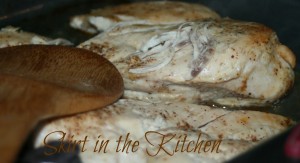 Place on chicken after a light coat of olive oil, seasoning on all sides of 2 large chicken breasts or 3 medium in size. Bake covered in a 350 degree oven for approximately an hour, give or take. Turn halfway through baking time to keep moist on both sides of each. When out of the oven, keep covered so it doesn’t dry out before ready to shred.