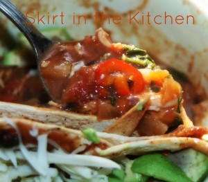 Quickly squeeze and add the juice of 1 whole lime, stir; then 32 ounces of chicken broth, 1 small can tomato paste, 1 can hot or mild Ro*tel tomatoes that are diced with green chilies. Stir in 1 can black refried beans (or puree 1 can whole drained and un-rinsed black beans) which will help with the consistency of the liquid, thickening the soup broth as well as adding flavor and nutrition. Add the shredded chicken plus the broth from it when it was baked.