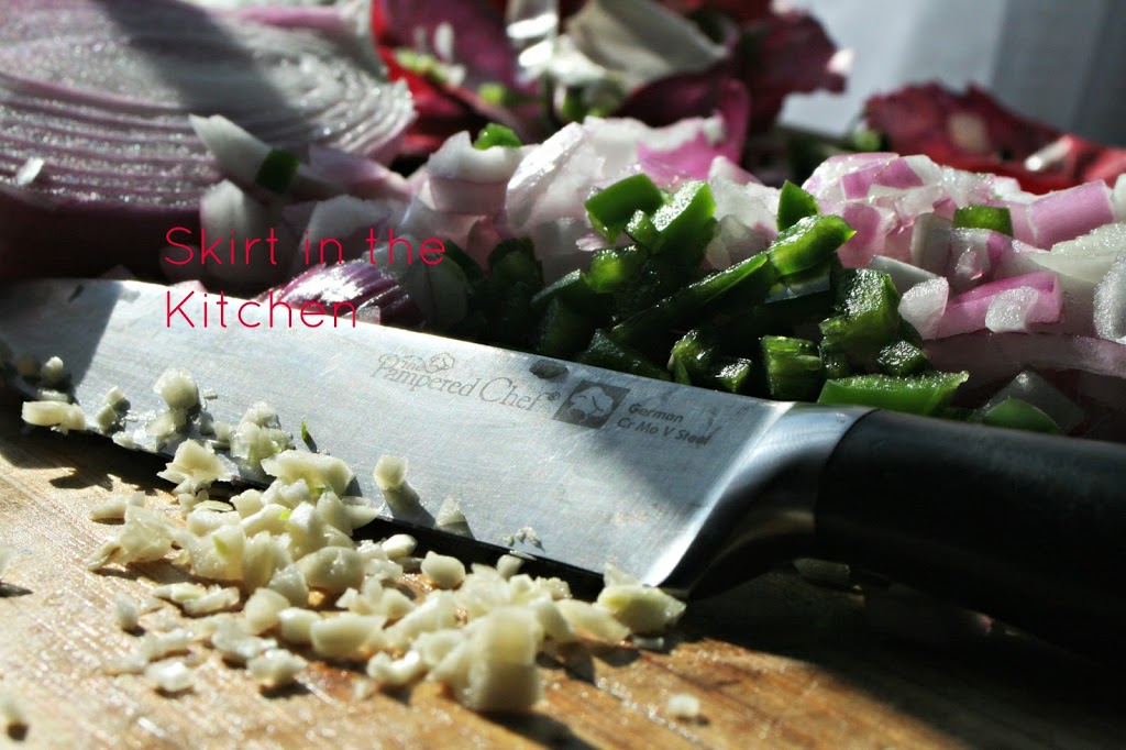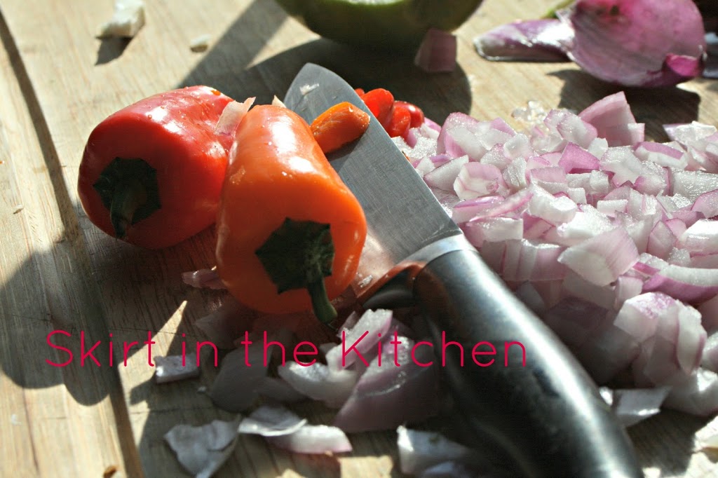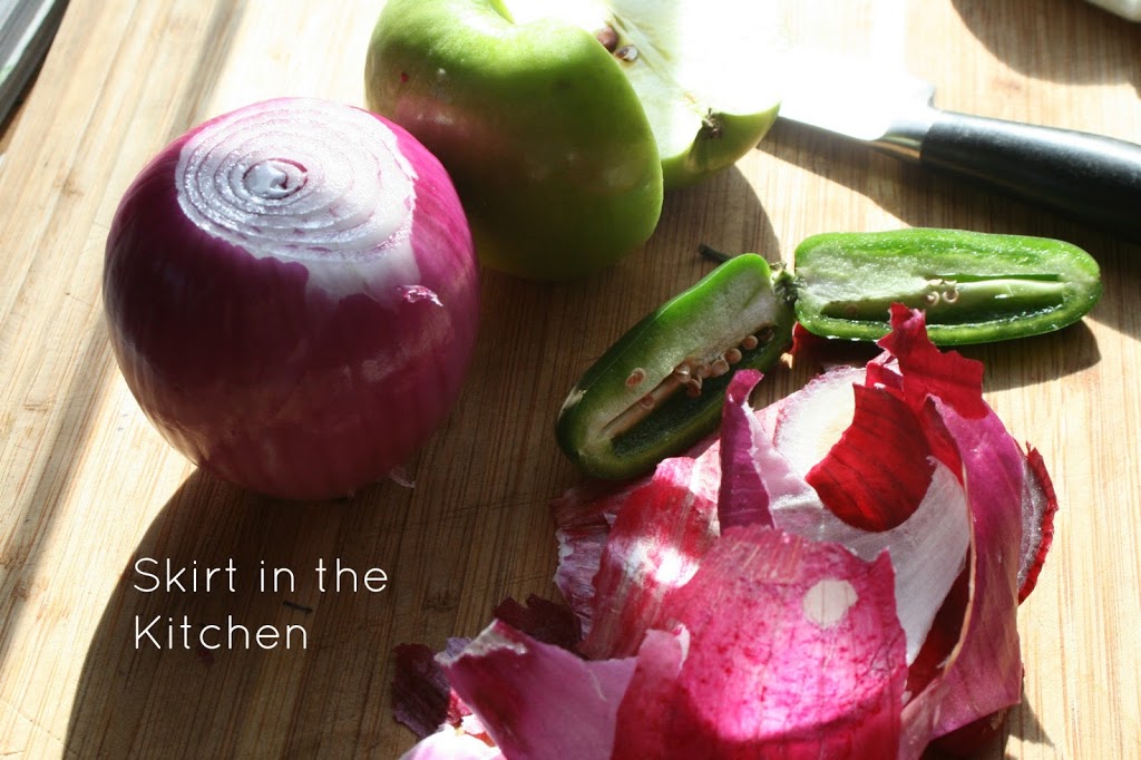 Chop 1/2 of a green apple, 1 seeded jalapeno, and 1/2 of a red onion.
