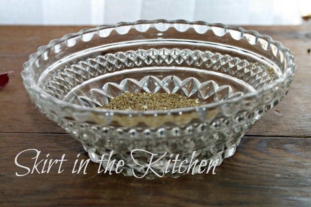 Mix seasoning of cumin, lemon pepper, finely ground ancho pepper, garlic salt, and just a little bit of kosher salt.