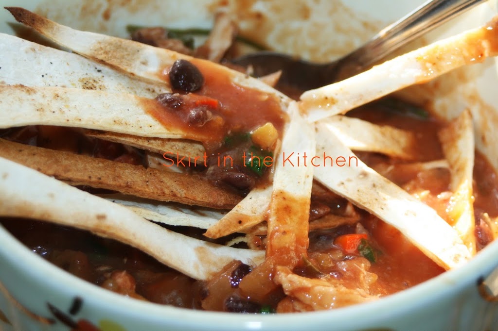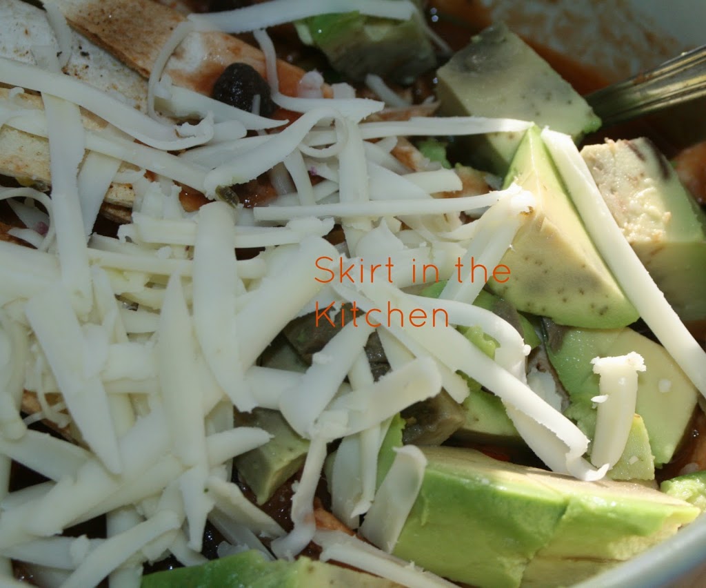 Top with toasted seasoned tortilla strips, pepper-jack cheese, and avocado.