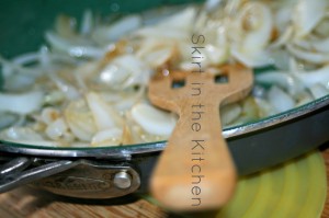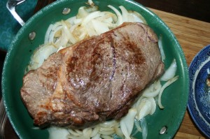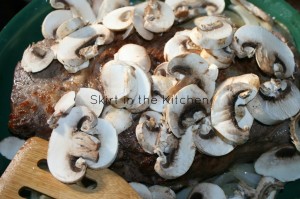 Transfer meat to a platter; cover with foil to keep warm and from drying out on the edges and top portion. Lightly brown onion in mushroom-infused olive oil, as well, adding a little more oil. Salt and pepper the onion pieces while cooking.