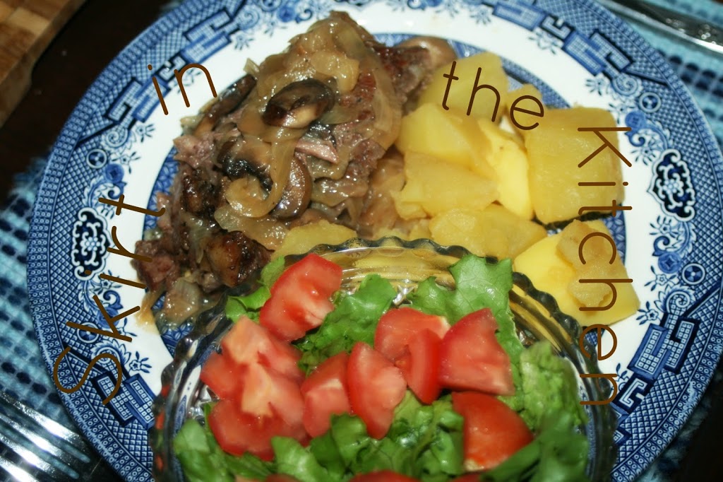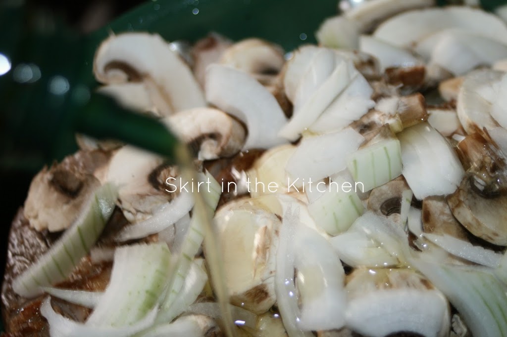 Transfer meat to a platter; cover with foil to keep warm and from drying out on the edges and top portion. Lightly brown onion in mushroom-infused olive oil, as well, adding a little more oil. Salt and pepper the onion pieces while cooking.