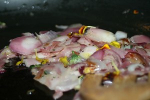You are here: Home / Uncategorized / Caramelized Onion Butter with Chive Blossoms and French Marigolds