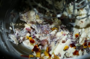 Sauté in butter to put back into butter 1 chopped red onion, lemon thyme, (organic) French marigold petals, and chive blossoms.  Add little salt, then freshly ground black pepper.