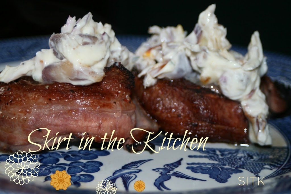 Sauté in butter to put back into butter 1 chopped red onion, lemon thyme, (organic) French marigold petals, and chive blossoms.  Add little salt, then freshly ground black pepper.