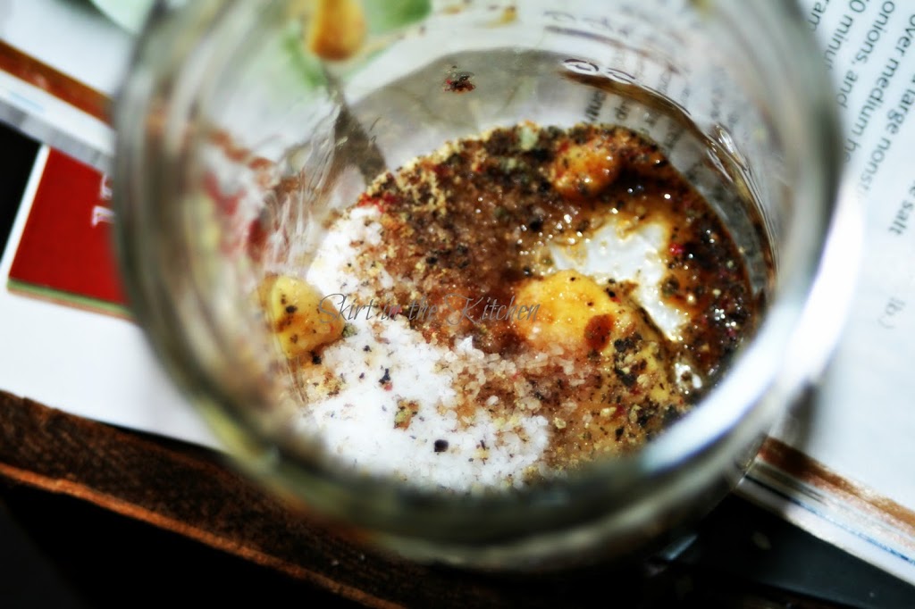 Mesh together:  1 tablespoon minced shallot, 1 teaspoon Dijon, 1 teaspoon brown sugar, 1/4 teaspoon salt, 1/4 teaspoon pepper, 1/4 teaspoon Worcestershire sauce.