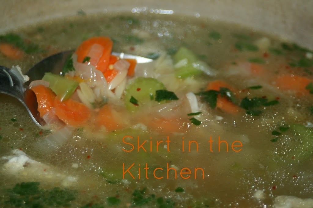 In the meantime, chopping on a diagonal, add 2 or 3 celery stalks, 1 or 2 carrots depending on size, then add orzo, fresh Italian parsley, and red pepper flakes. Cook the carrots barely to a crunch, not cooking all the way through; drop in chicken that has been separated from the bone. Taste to add more salt and Worcestershire black pepper if needed.